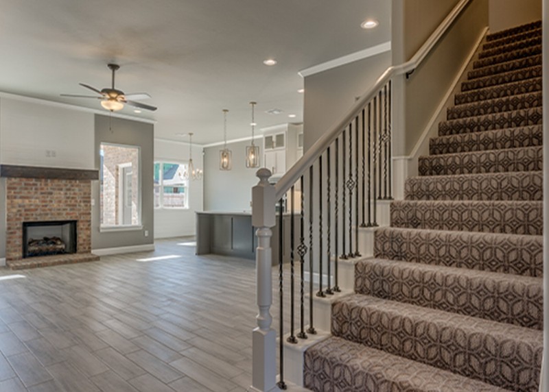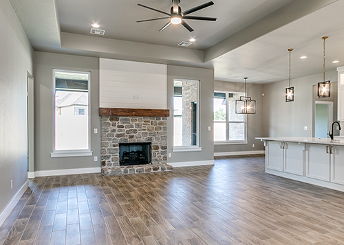 The Marshall Custom Home by Merryfield Homes offers 2,687 sq. ft. of living space with three bedrooms, two dining areas, and two and a half bathrooms. Built on a private five-acre property in Mustang, this home combines a full-stone exterior, metal roof, and a 360 sq. ft. covered indoor patio with glass garage doors. It’s a striking example of craftsmanship and comfort that defines Merryfield Homes.
